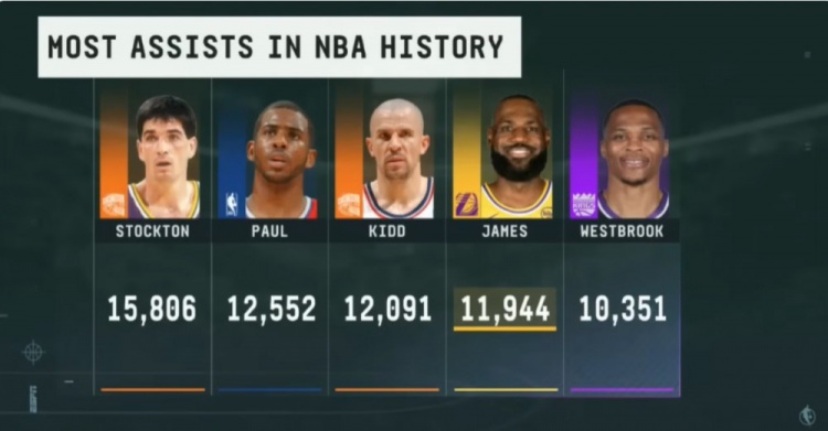 有望进历史助攻榜前三?詹姆斯职业生涯助攻仅落后基德147次!